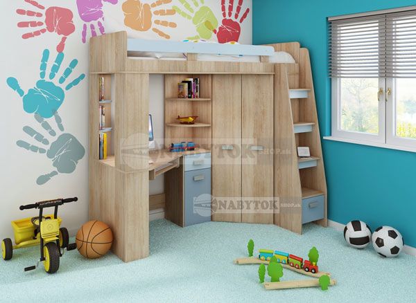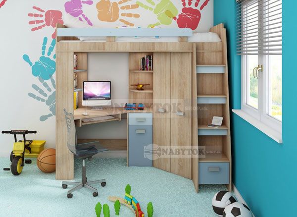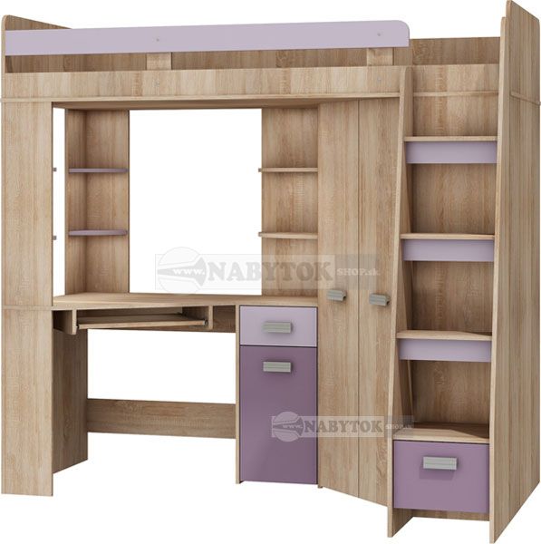 | Prevedenie | 1x 2dv.rohová skriňa - police/šatník + 1x rohový stolík s výs.klávesnicou,skrinkou a zásuvkou + podporné rohové police + 1x posteľ (bez roštu a matraca 80x200 cm) + samostatné schodisko s 1x úložným priestorom |