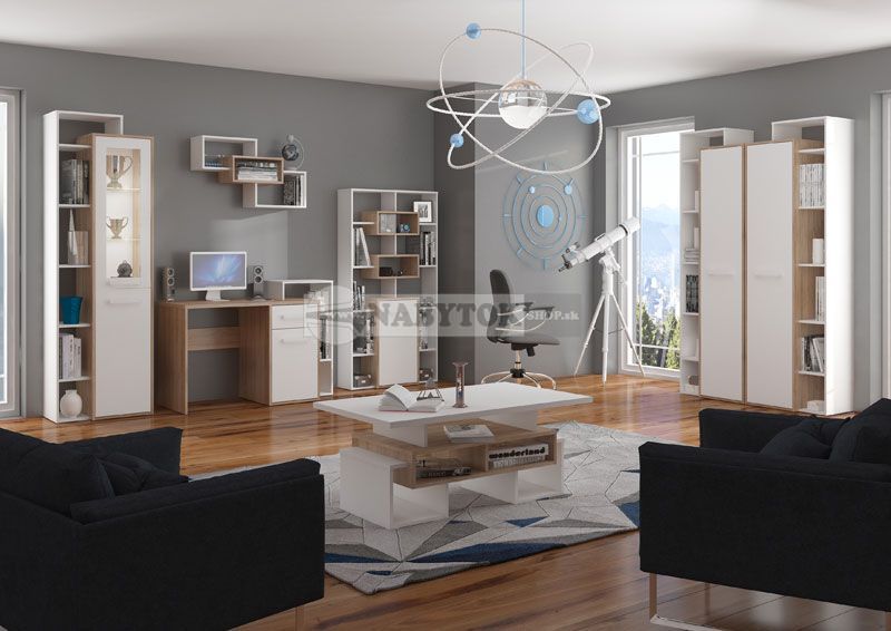 Detská izba RIO zostava 08 sektor: vitrína RIO-26 L1D, polica RIO-17 M, regál RIO-19 1D, písací stolík RIO-04 P, skrinka vysoká RIO-01 L, skrinka vysoká RIO-02 P (bez konferenčný stolík RIO-12 S a LED osvetlenia, možnosť dokúpiť).