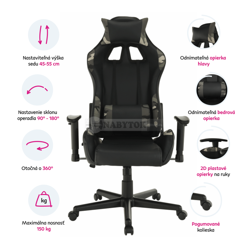 | Prevedenie | výškovo nastaviteľná / s podrúčkami / na kolieskach / otočné o 360° / nastavenie sklonu operadla 90° - 180° / s vankúšikmi v oblasti chrbta a hlavy / odnímateľná opierka hlavy a bedrová opierka / bedrová opierka je výškovo nastaviteľná / ergonomický tvarované vysoké operadlo / rozšírená chrbtová časť / tvarované sedadlo / nastavenie hojdania / podrúčky sa dajú výškovo nastaviť a otáčať vpravo/vľavo |