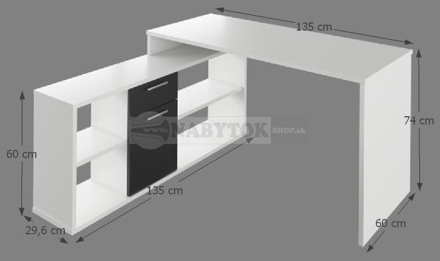 PC stolík NOE NEW poskytuje dostatok miesta na prácu, aj veľa úložného priestoru. Skladá sa z dvoch častí. Jedna časť je klasický PC stolík. Druhá časť je vybavená zásuvkou, skrinkou a jednoduchými poličkami.