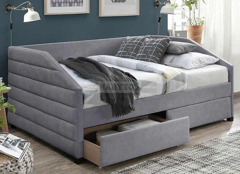 Prevedenies roštom/s úložným priestorom (2x zásuvka)/nízke zadné čelo a dve bočné čelá, ktoré sú dekoratívne prešívané a slúžia nielen ako dizajnový prvok, ale aj ako pohodlná opora chrbta pri čítaní alebo sledovaní televízie v posteli