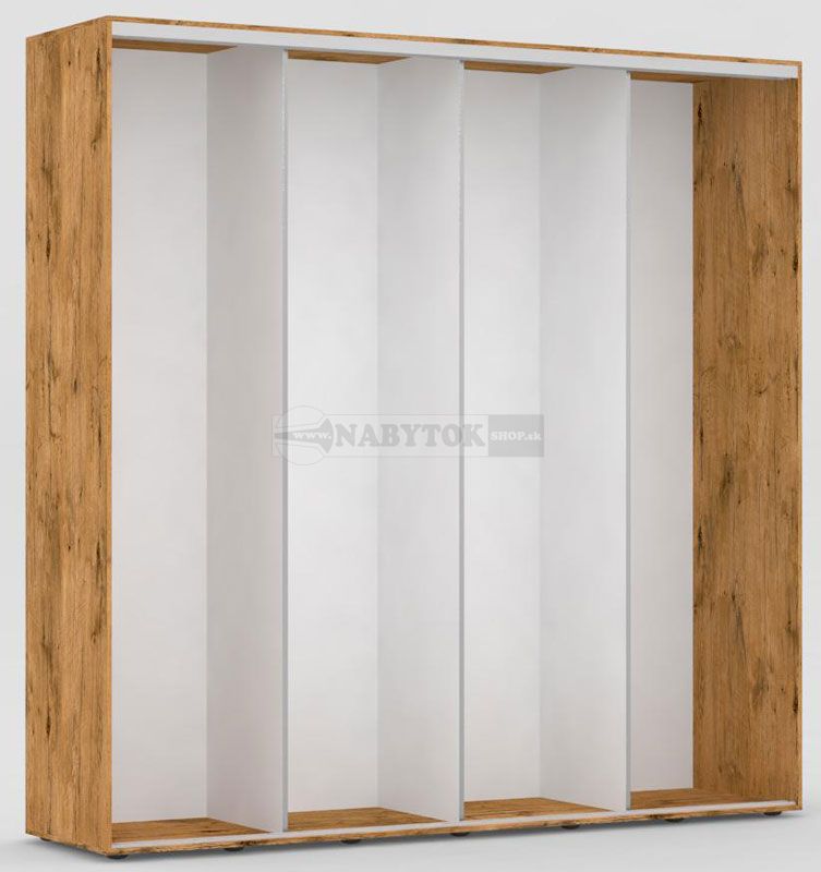 | Prevedenie | 1x korpus/4x dvere posuvné/2x tyč na vešanie/4x kontajner do skrine/10x polica/použité kvalitné kovanie s ložiskovým posuvom/spodné dno použité rektifikačné klzáky kvôli nerovnosti podlahy, aby bol umožnený ľahký chod dverí/dvere majú po oboch stranách protinárazové lišty, na spodnej vodiacej lište je krytka skrutiek/zvyslé steny korpusu majú po celej výške predvŕtané diery na police |