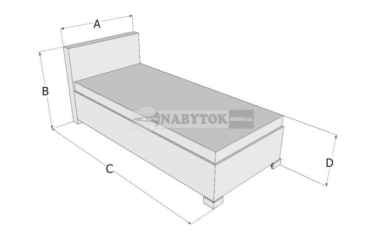 RozmeryŠxVxH: vonkajší rozmer: 86x107x212 cm, vnútorný rozmer: 80x200 cm, výška ložnej plochy: cca 49 - 60 cm podľa výšky nožičiek + matraca, výška nožičiek 1, 2: 6 cm, výška nožičiek 3, 4, 5, 6: 12 cm, výška topperu MONI: 2 cm, výška topperu AERO, EXTRA: 6 cm