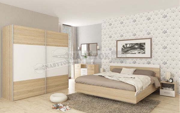 Spálňa GABRIELA zostava, sektor: 1x skriňa GABRIELA s posuvnými dverami, 2x nočný stolík GABRIELA, 1x posteľ GABRIELA (bez komody GABRIELA, roštu, matraca a políc do skrine, možnosť dokúpiť)